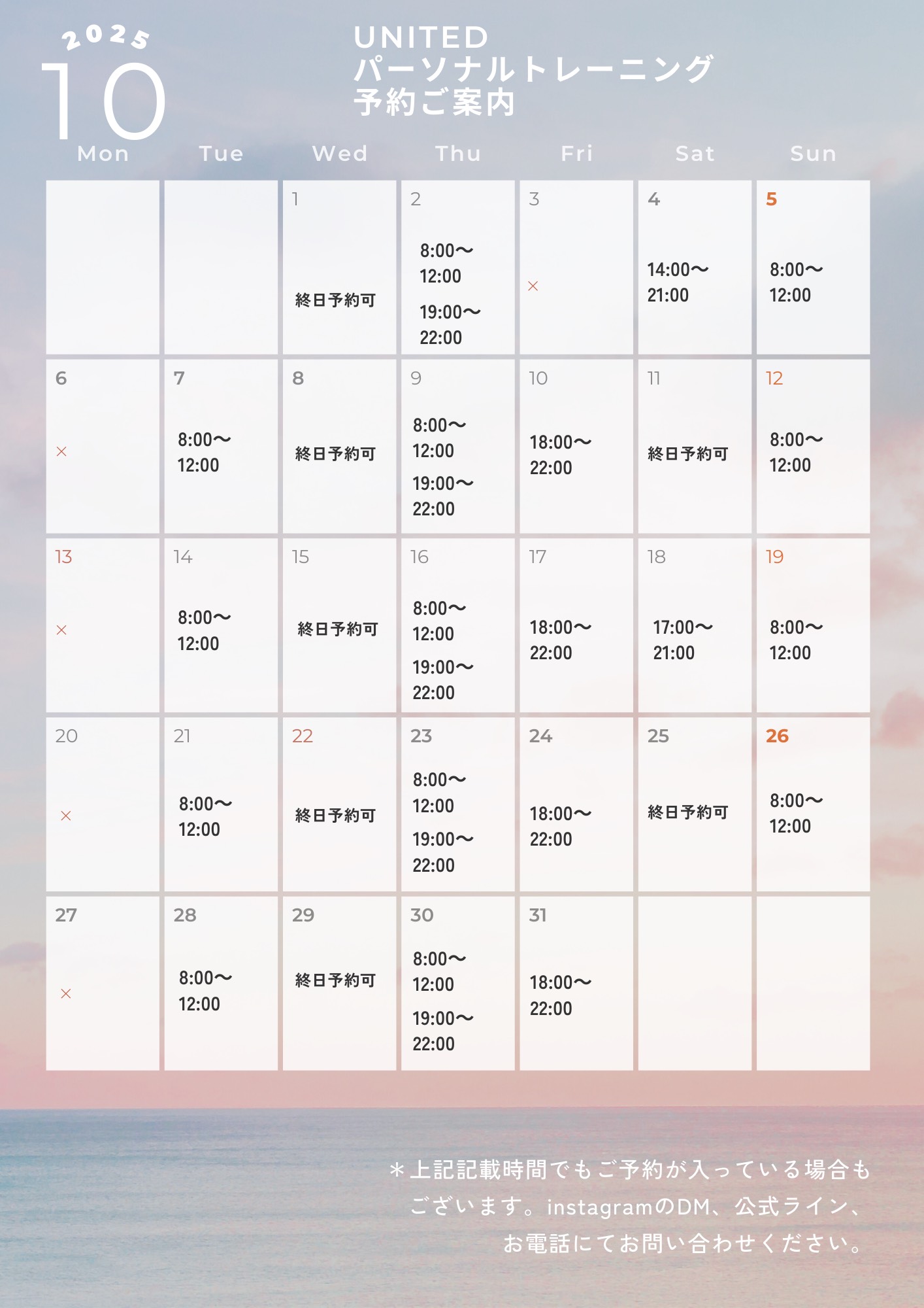 パーソナルトレーニングジムUNITED10月のご予約ご案内となります♪