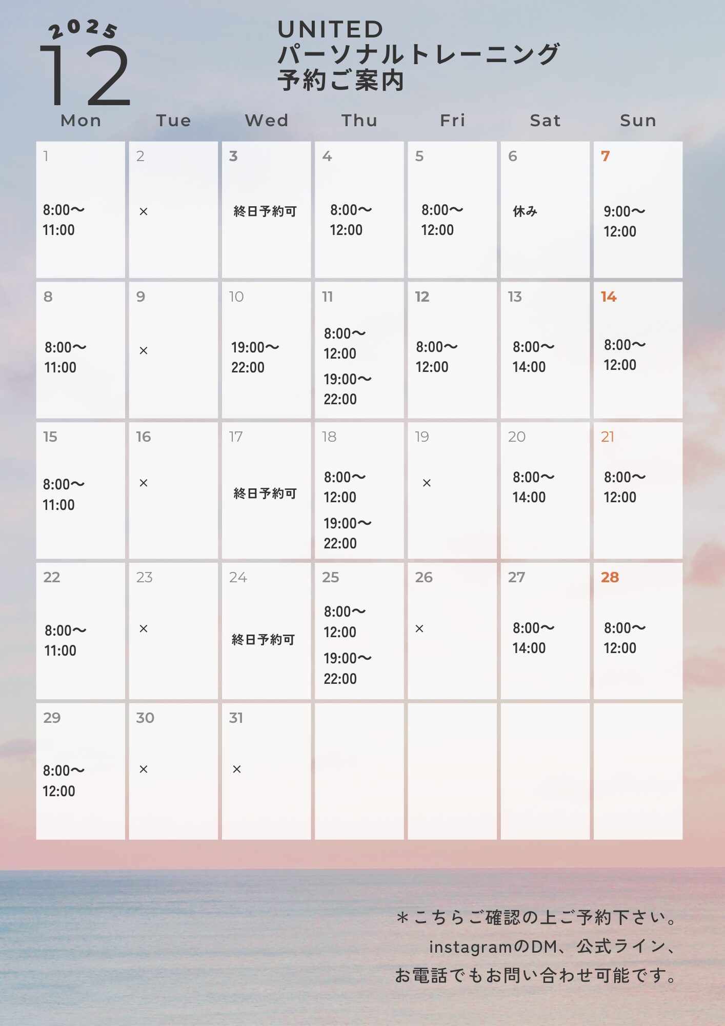パーソナルトレーニングジムUNITED12月のご予約ご案内となります♪