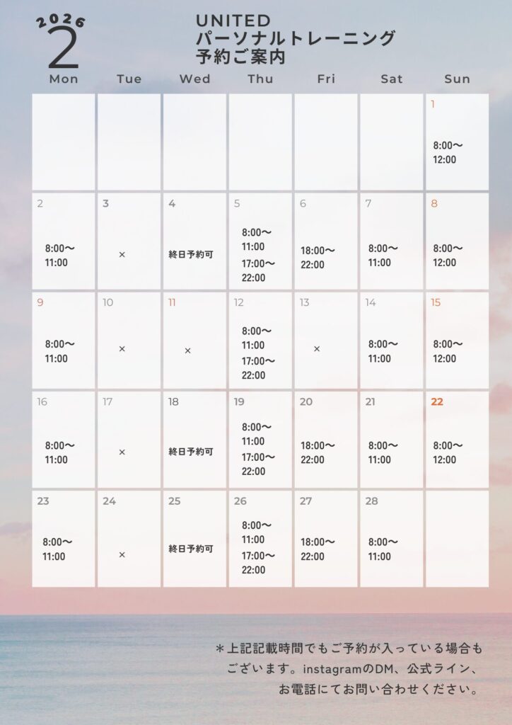 晩冬の候、皆様におかれましては益々ご清栄のこととお慶び申し上げます。 パーソナルトレーニングジムUNITED2026年2月のご予約ご案内となります。 各日時により営業時間異なります。ご確認の上ご予約いただけると助かります。 また、お問い合わせご予約の...